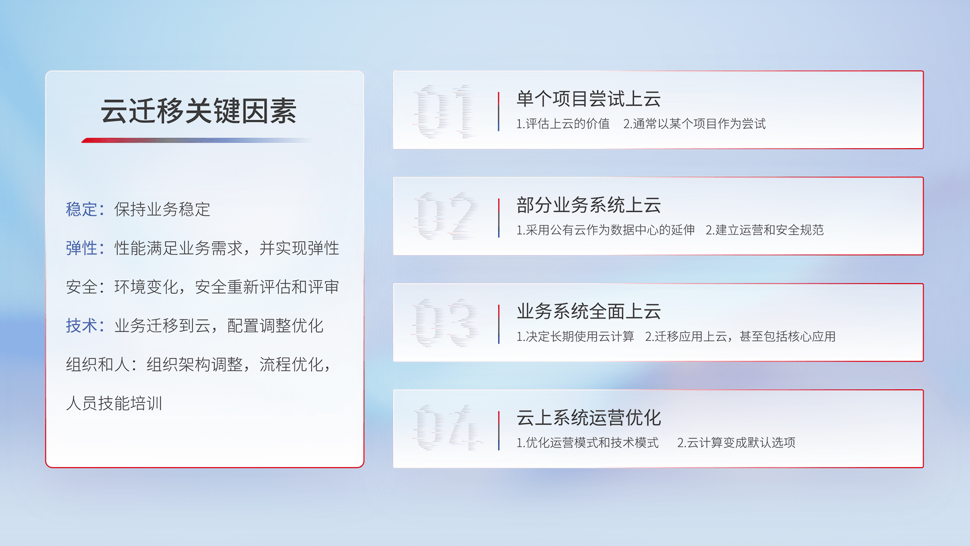 结合实际业务,,从规划设计、、、、云平台选型、、、云原生改造、、、、数据迁移、、、、集成交付,,,,迁移全过程为客户识别最佳上云路径,,,做好风险识别管理,,设计网络架构、、、身份权限、、、、安全审计合规、、操作审计、、、、日志审计、、监控告警策略、、、、多站点容灾设计等,,对云上基础设施进行整体规划,,,,提升IT治理水平,,以满足弹性、、高可用、、高性能的需求。。