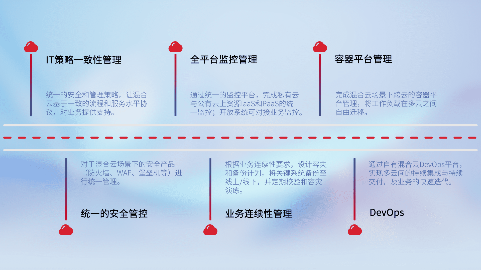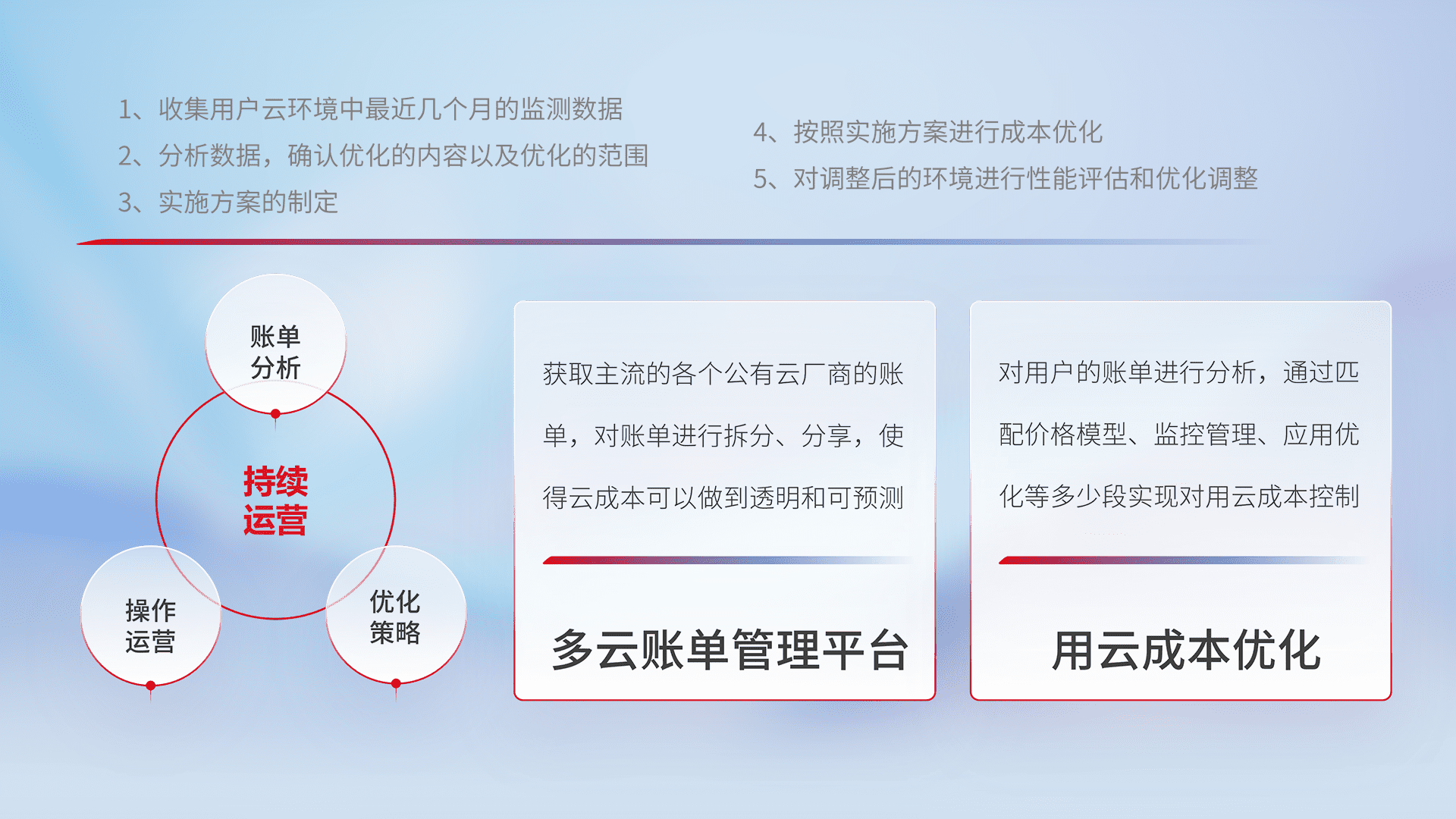通过多云纳管,,,,以统一的资源数据模型把客户的云资源进行抽象和封装,,,进而实现对多云资源的统一操作,,,保障云资源管理的可靠性、、、、稳定性与可用性。。。。量身定制化运维内容,,,配置、、开发运维、、、补丁管理、、、、备份、、、、监控、、、、认证和访问管理、、审计和日常巡检等,,,,保障在用云过程中的可靠度,,,,稳定度以及高可用率。。。。