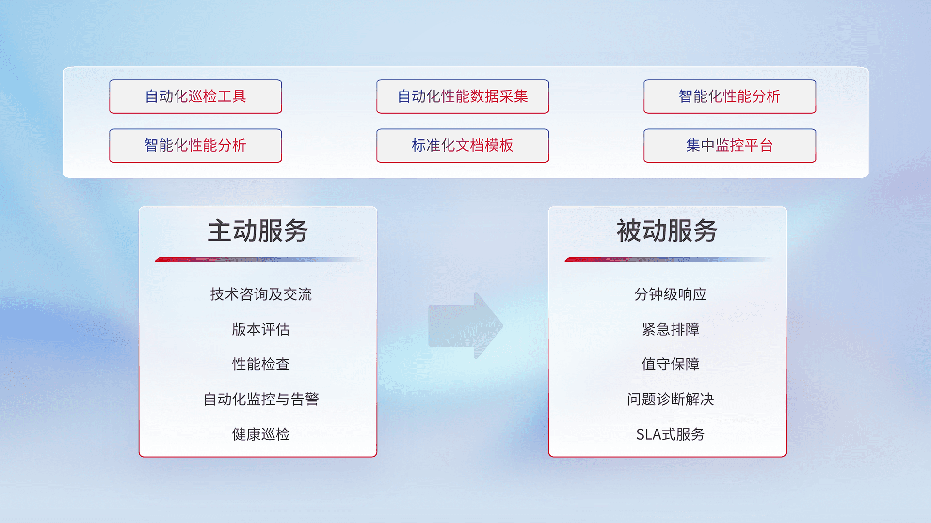 智能化工具和标准化文档,,保障服务质量,,提供主动服务(包含技术咨询、、、版本评估、、、性能检查、、、自动化监控与告警、、、、健康巡检)和被动服务包含(分钟级响应、、紧急排障、、、、值守保障、、问题诊断解决、、SLA服务)。。。